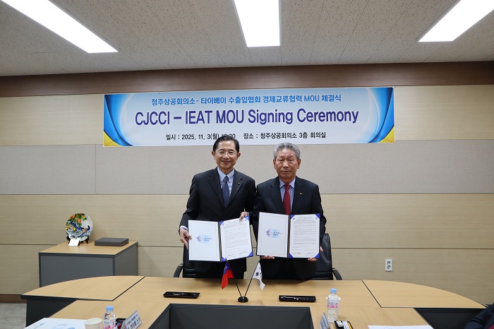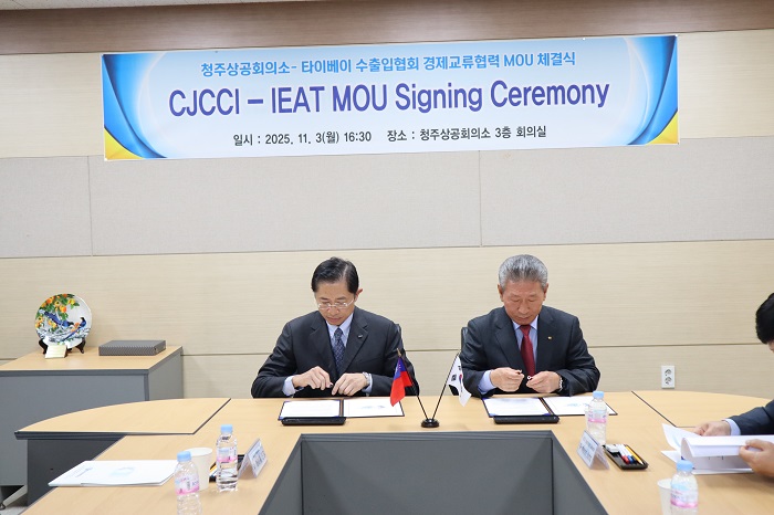 이어진 MOU 체결식에는 청주상의 회장 및 부회장 등 5명과 고 옌후이 대만수출입협회(IEAT) 타이완-한국 경제 및 무역 위원장을 비롯한 7명의 경제교류단이 참석해 △무역 및 경제 협력 증진 △무역 전시회 및 박람회 개최 상호 지원 △시장정보 공유 및 회원사 홍보 △중소기업 해외진출 △제3국 시장 공동 개발 등 분야에서 협력키로 합의했다.