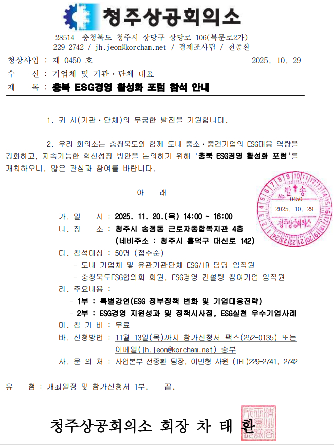 | ‒ | 충북 ESG경영 활성화 포럼 참석 안내 |