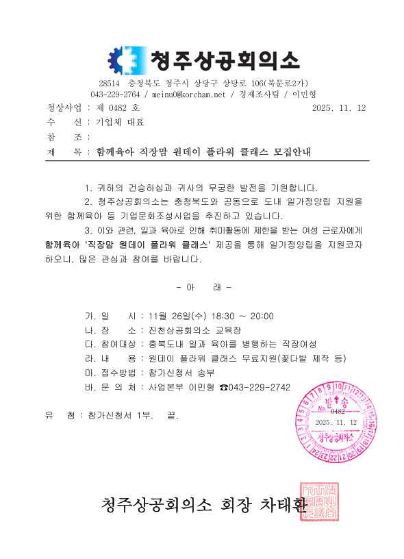 대표전화 : Tel : 043-229-2700 문의 : cheongju@korcham.net