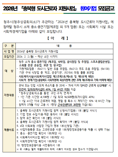 | 제목 | 2026년 충북형 도시근로자 지원사업 참여기업 모집공고 | ||