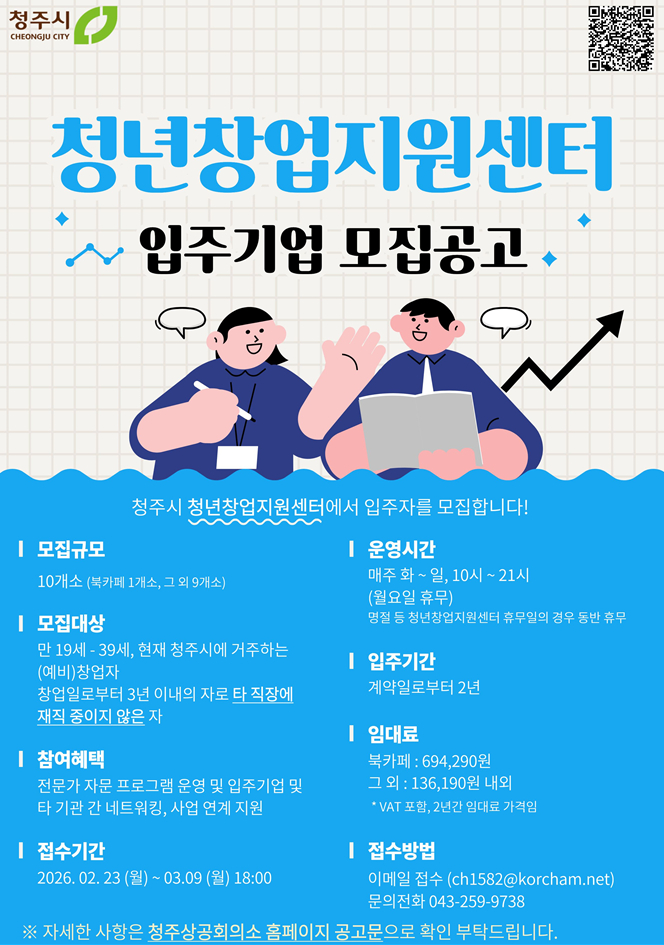| 제목 | 2026년 청주시 청년창업지원센터 입주자 모집 공고 | ||