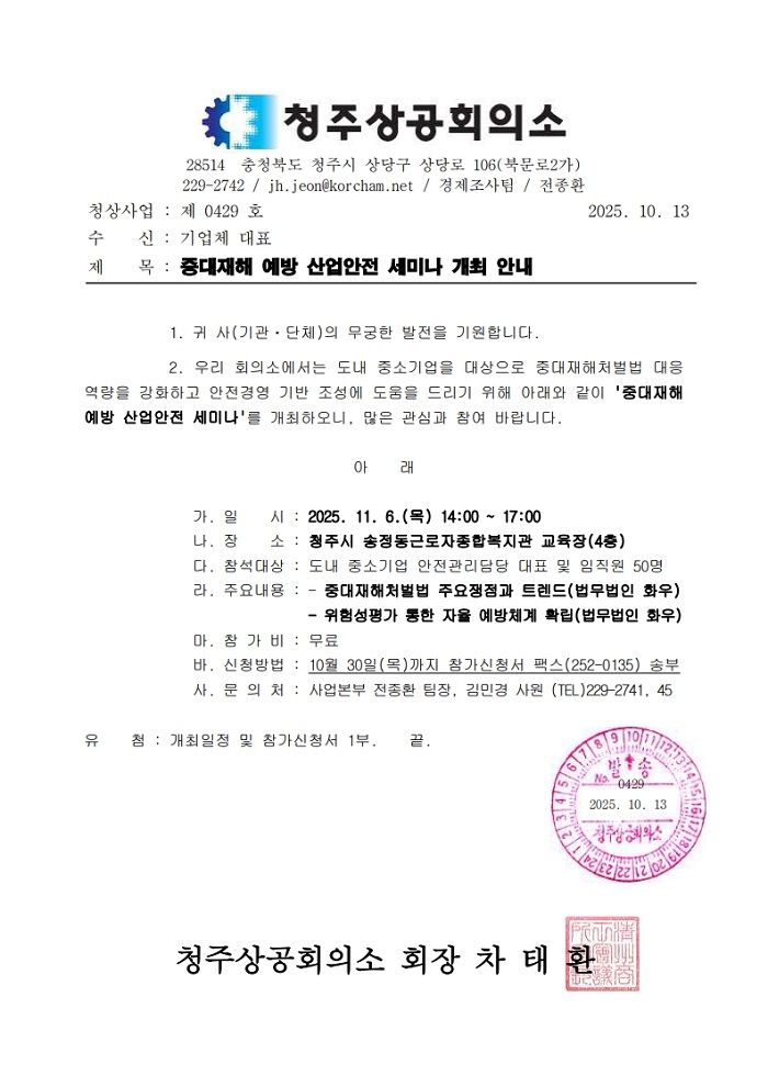 대표전화 : Tel : 043-229-2700 문의 : cheongju@korcham.net